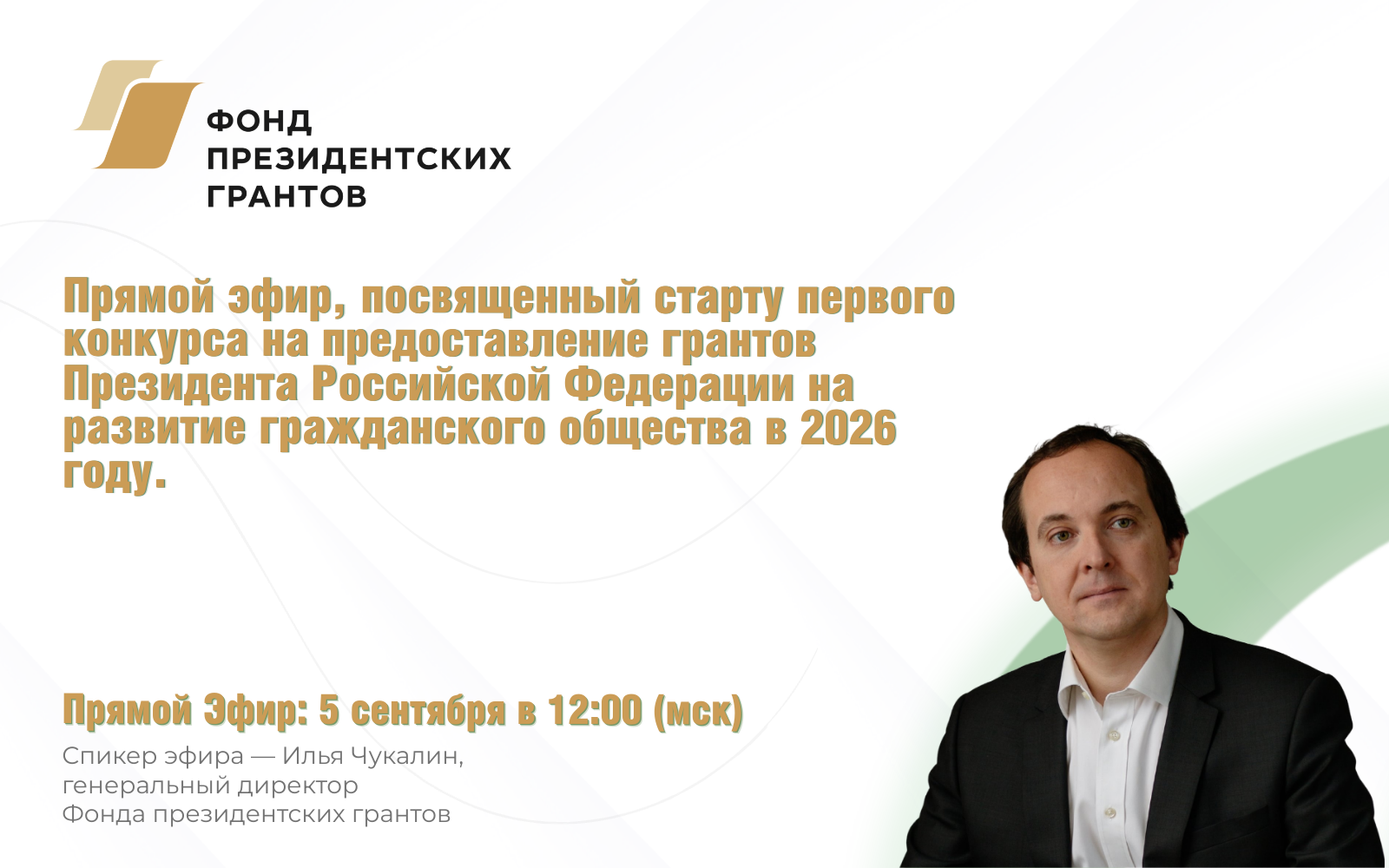5 сентября в 12:00 (мск) на страничке Фонда президентских грантов «ВКонтакте» пройдет прямой эфир, посвященный старту первого конкурса на предоставление грантов Президента Российской Федерации на развитие гражданского общества в 2026 году.