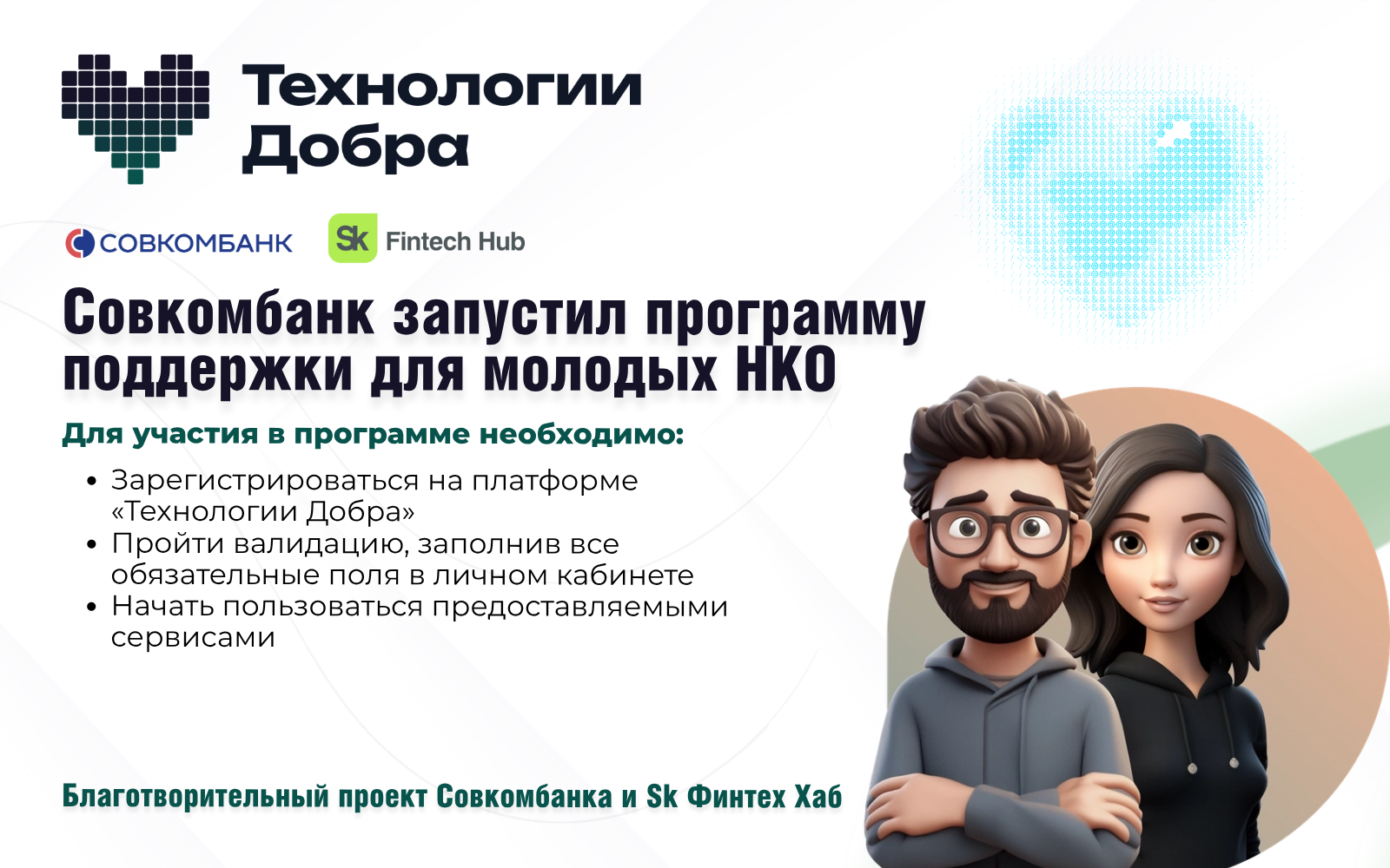 Совкомбанк в рамках проекта «Технологии Добра» запустил специальную программу поддержки для некоммерческих организаций, зарегистрированных менее шести месяцев назад. Это комплексное решение поможет начинающим НКО сосредоточиться на своей социальной миссии, взяв на себя технические и финансовые вопросы .