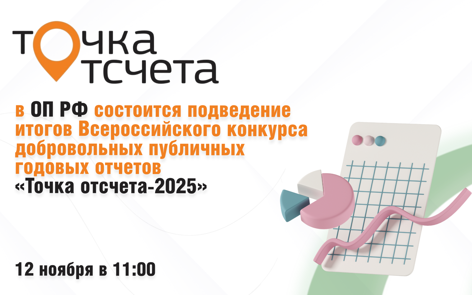 Уважаемые коллеги! ✨ Приглашаем вас на торжественное подведение итогов Всероссийского конкурса добровольных публичных годовых отчетов «Точка отсчета-2025», которое состоится 12 ноября в 11:00 в Общественной палате РФ.