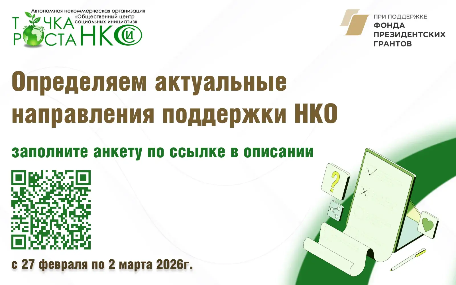 📌 Результаты опроса будут учтены при планировании деятельности в рамках нового проекта «Точка роста НКО» (победитель конкурса Фонда президентских грантов 2026 года).